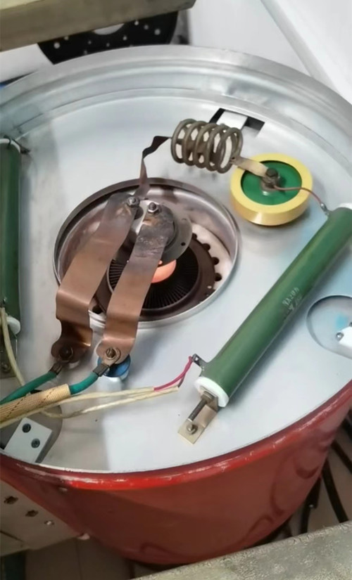到達(dá)現(xiàn)場(chǎng)后我們還是按照老套路對(duì)設(shè)備進(jìn)行簡(jiǎn)單的檢測(cè),在檢修過(guò)程中發(fā)現(xiàn)高頻熱合機(jī)可調(diào)電阻有燒壞的現(xiàn)象,但是這款機(jī)器的電阻安裝方式有點(diǎn)特殊,直接更換不好下手,需要把震蕩桶拆卸后才能更換。沒(méi)有多想直接拆卸震蕩桶后更換新的電阻,安裝后并把機(jī)器組裝好進(jìn)行測(cè)試,此時(shí)高頻熱合機(jī)就可以正常顯示電流,我們用客戶的模具對(duì)設(shè)備進(jìn)行測(cè)試,機(jī)器可以正常使用。