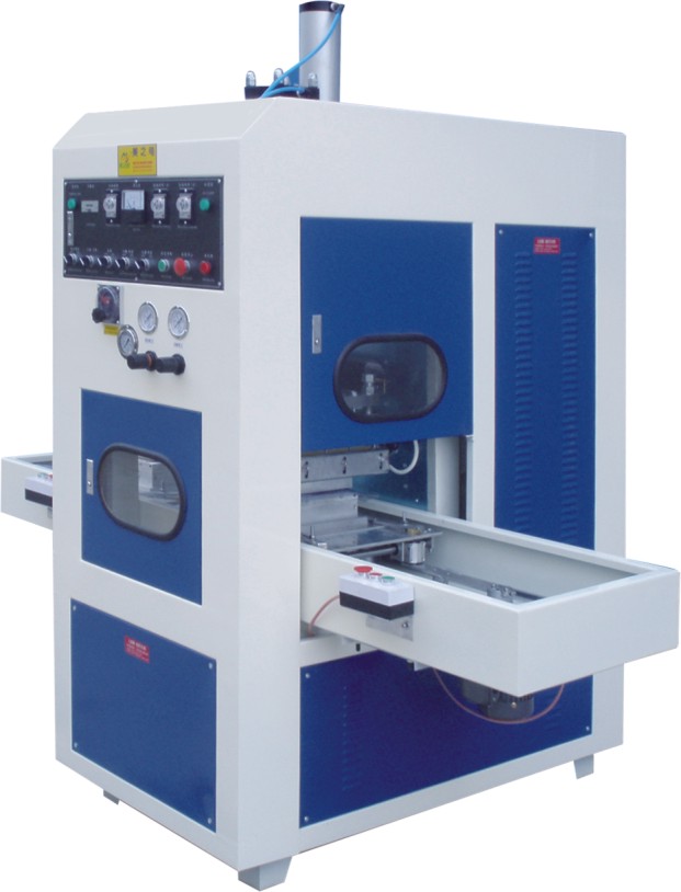 2、高周波熔斷機帶自動滑臺裝置,工作時通過滑臺輸送產(chǎn)品,進入中間工位,機頭上氣缸自動下降,高頻自動熔接,冷卻定型(裁斷)機頭上升、滑臺自動退出,手工取出成品。左右工位可利用拿放產(chǎn)品的時間差交替工作。