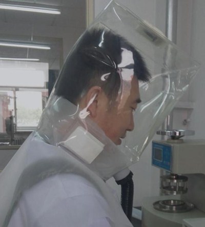 隔離防護(hù)頭罩屬于醫(yī)療防護(hù)器械,特別是一種使頭部與外界環(huán)境處于完全密封,具有隔離病毒、有害氣體、灰塵等有害物質(zhì)的多功能隔離防護(hù)頭罩;目前用于特種醫(yī)療防護(hù)的制品一般有防毒口罩和防毒面具。前者采用橡膠體,嘴部裝有空氣過(guò)濾罐;后者采用無(wú)紡布或者PVC膜材整體可將頭部罩住,嘴部設(shè)置吸氣軟管,軟管遠(yuǎn)端裝有空氣過(guò)濾器。兩者使用時(shí)均依靠人的自然呼吸來(lái)吸入空氣和呼出廢氣,密閉的氣流空間較小,即使短時(shí)間使用,也明顯有缺氧感覺(jué)。